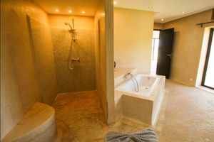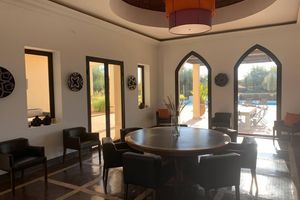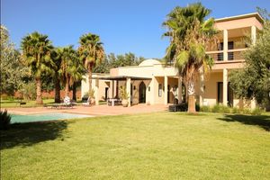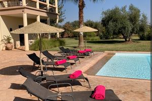 Magnifique villa de 600m2 sur plus de 1 hectare de terrain arboré. Située dans un domaine résidentiel à la campagne dans une oliveraie, sans vis à vis. 4 chambres spacieuses avec chacune leur salle de bains avec baignoire et douche. Piscine et hammam privé. Cette villa est située au km19 route de Fès, après 5 minutes de piste, calme absolu et dépaysement total garanti. Temps de trajet :