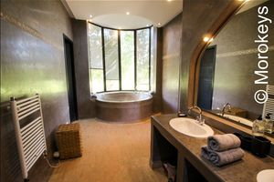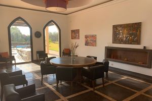 Magnifique villa de 600m2 sur plus de 1 hectare de terrain arboré. Située dans un domaine résidentiel à la campagne dans une oliveraie, sans vis à vis. 4 chambres spacieuses avec chacune leur salle de bains avec baignoire et douche. Piscine et hammam privé. Cette villa est située au km19 route de Fès, après 5 minutes de piste, calme absolu et dépaysement total garanti. Temps de trajet :